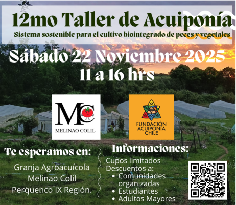 La Fundación Acuiponía Chile anunció la decimosegunda versión de su Taller de Acuiponía, que se llevará a cabo el sábado 22 de noviembre de 2025, entre 11:00 y 16:00 horas, en la Granja Agroacuícola Melinao Colil, comuna de Perquenco, Región de La Araucanía. La jornada se desarrollará en formato presencial y busca acercar a productores, estudiantes y profesionales a la implementación de sistemas biointegrados agroacuícolas.