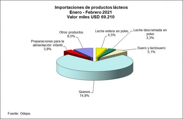 La importación de productos lácteos sigue creciendo y sumó US$ 69,2 millones entre - febrero de 2021, 42,3% impulsado por los quesos