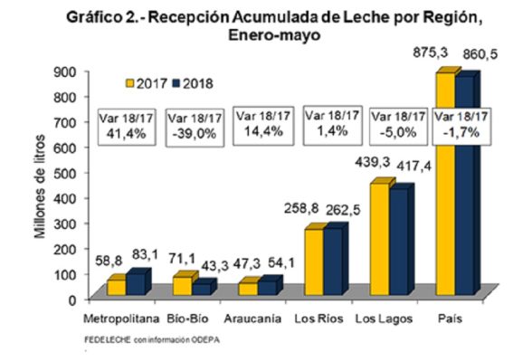La región de Los Ríos mostró un mejor resultado al reportar un incremento en su recepción de leche de un 1,4% hasta los 262,5 millones de litros. De igual manera, la región de La Araucanía anotó un incremento de un 14,4% hasta los 54,1 millones de litros.